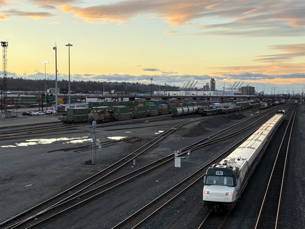 ここに滞在していた十数分の間,旅客列車の少ないアメリカにおいては珍しく短時間の間で3本の列車が通過し,中には2編成しか現存していないタルゴ社製のレアな編成(画像の白い車両)であったそうでとても運が良かったです.